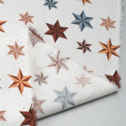 Tela de navidad con estrellas de colores, en un tejido de algodón de trama plana y cerrada con un tacto muy agradable. Al tratarse de un producto natural, el algodón, resulta fácil de limpiar. Gracias a su fácil manejo, es una tela ideal para la confección de todo tipo artículos para el hogar.