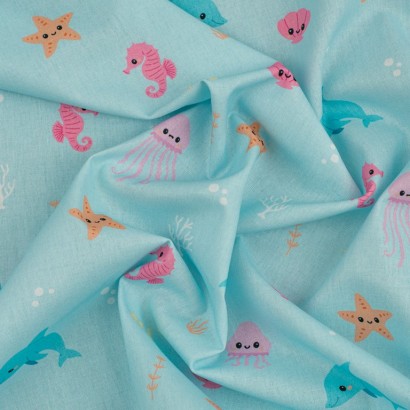 Tela de algodón con divertidos animales marinos. Tejido resistente, de trama plana y cerrada con un acabado mate de alta calidad. Su tacto es muy agradable y su textura perfecta para la confección de todo tipo de prendas o complementos. Muy aconsejable para principiantes en la costura por su fácil manejo.