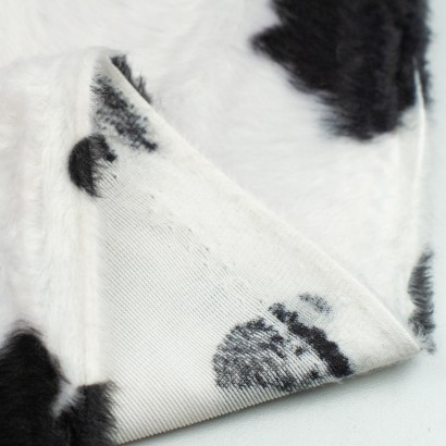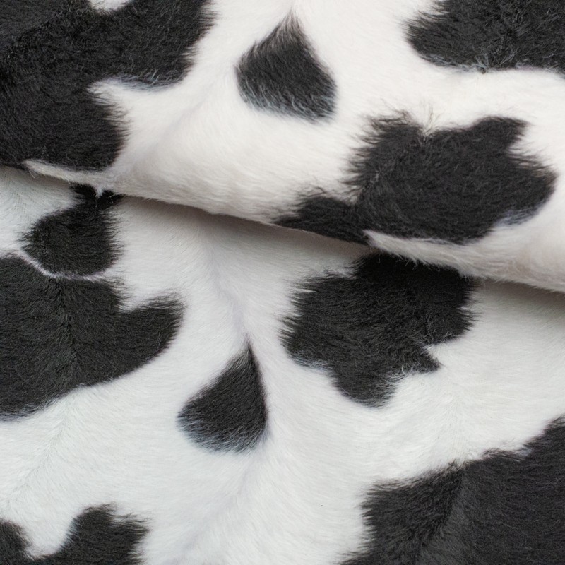 Tela de pelo corto, con estampado de vaca en tonos blancos y negros 100% acrílica.Es un tejido tipo antelina con mayor gramaje, tipo peluche. Muy suave y de fácil manejo, ideal para disfraces de carnaval.