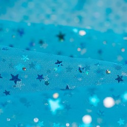 Tela de tul con estrellas de colores que brillan con la luz. Es un tejido fino y transparente,  con cierta rigidez. Tacto áspero y de fácil manejo. Ideal para disfraces de carnaval.